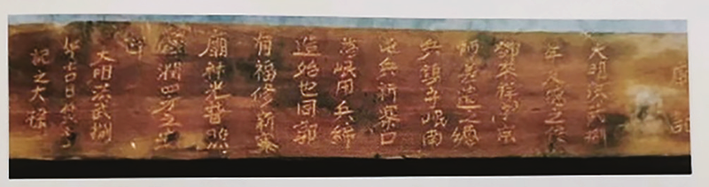 二世祖邓钦(来祥公)所修“新寨庙”庙记,刻于横梁之上。文曰:“大明洪武八年,友德之后邓来