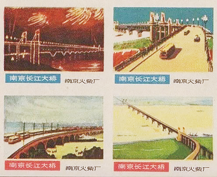 南京火柴厂出品过一套四枚的南京长江大桥“火花”,第一枚是大桥夜景,桥身灯火通明,大桥上方的夜空中燃放着烟花,烟花和灯火倒映在江面上,熠熠生辉,景色十分壮美。第二枚是大桥引桥的正面图景,宽阔的桥面上行驶着车辆,人行道上行走着行人,桥堡、桥上的路灯、远处大桥的桥身、江面上有一艘船正在通行,画面极其逼真。第三枚是大桥桥身正面图,桥上车辆有序通行,桥下行驶着江轮,天上飘着彩云。第四枚是大桥全景鸟瞰图,雄伟的大桥让天堑变通途,大桥气势壮阔,雄壮巍峨。南京长江大桥是我国自主建造的第一座长江大桥,南京火柴厂这四枚“火花”虽然小巧,且只是火柴盒上的贴画,但设计者一点都不敷衍塞责,而是独具匠心,精巧构图,让“火花”这朵“火柴盒上的艺术之花”绽放出璀璨的光芒。