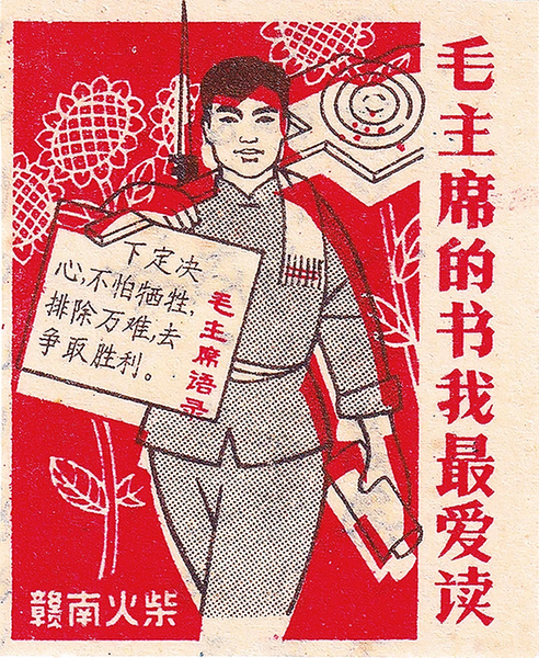 赣南火柴厂一款“火花”“毛主席的书我最爱读”,设计十分精美,主画面是一位打靶归来的民兵,民兵身材魁梧,精神抖擞,他背着枪,枪上上着刺刀,左肩上扛着靶,左胸前是一块“下定决心,不怕牺牲,排除万难,去争取胜利。”的“毛主席语录”牌。民兵的身后是数株蓬勃的向日葵。民兵右肩搭着一条毛巾,右手是一卷书。画面左下角是“赣南火柴”四个字,右侧是“毛主席的书我最爱读”几个大字。整个画面以红色为主色调,木版画印制,布局合理,主旨突出,极富时代特色,充分展示出了设计者的匠心。