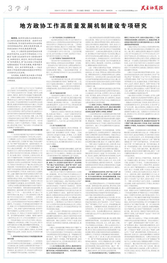 地方政协工作高质量发展机制建设专项研究