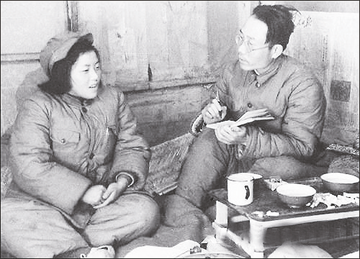 1952年,魏巍(右)在朝鲜三登野战医院采访志愿军模范护士罗克贤