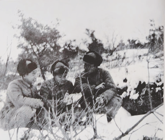 1952年冬,魏巍(右一)在朝鲜战地与志愿军在一起。