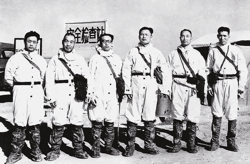 第一次原子弹试验的前线指挥部部分领导:(右至左)毕庆堂、张爱萍、刘西尧、刘柏罗、张蕴钰、苑华冰。早试还是晚试