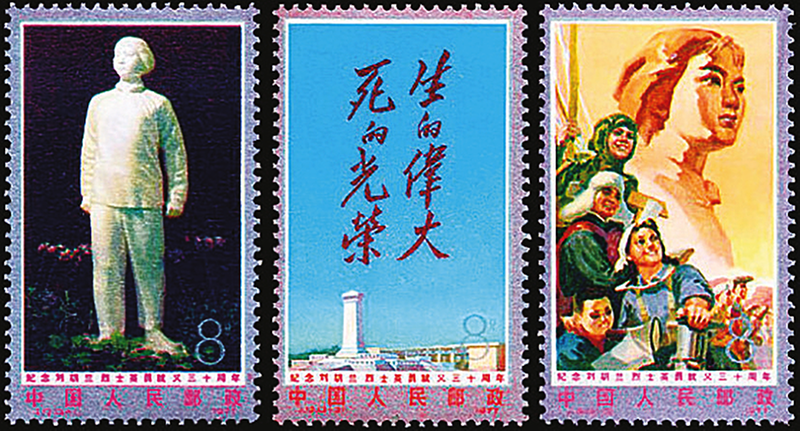 1977年1月31日,原邮电部发行的《纪念刘胡兰烈士英勇就义三十周年》纪念邮票一套3枚(图二)。邮票图案取材于刘胡兰纪念馆。第一枚为“刘胡兰烈士像”;第二枚为毛泽东题字的手迹“生的伟大,死的光荣”;第三枚为工、农、兵、学、商和刘胡兰塑像。刘胡兰,1932年出生于山西省文水县云周西村。她10岁参加抗日儿童团,1947年1月12日,国民党军队袭击云周西村时,因叛徒出卖被捕。面对敌人,她坚贞不屈,大义凛然,从容就义。
