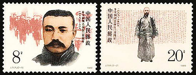 1989年10月29日,中国邮政发行的《李大钊同志诞生一百周年》纪念邮票一套2枚(图三)。邮票图名分别为:第一枚“李大钊像”。背景是一幅历史照片,展示的是:在确定了国共合作的中国国民党第一次全国代表大会上,李大钊与孙中山一起步出会场的情景。第二枚“大义凛然”。邮票画面是李大钊被捕后临刑前的一幅照片。人物的背景是竖立在北京万安公墓李大钊墓前巨大石碑上的碑文。
