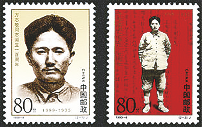 1999年8月21日,中国邮政发行的《方志敏同志诞生一百周年》纪念邮票一套2枚(图四)。邮票图名分别为“方志敏像”和“坚贞不屈”。方志敏是中国无产阶级革命家,中共第六届中央委员,中华苏维埃共和国中央执行委员,主席团委员。他曾领导戈横起义,是赣东北红军和苏区创建人之一。1934年他率红军抗日先遣队北上抗日,在江西遭遇国民党反动派阻击,被捕,在狱中坚贞不屈,于次年在江西南昌英勇就义。