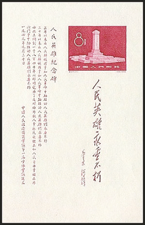 “缅怀英烈志,共铸中华魂”。在我国传统节日清明节到来之际,翻开笔者的集邮藏册,一枚枚珍贵的革命烈士纪念邮票,铭记着无数革命先烈为了民族解放,保家卫国而壮烈捐躯的爱国壮举,方寸之间书写了先烈们浴血奋战、可歌可泣的英雄诗篇。1949年9月30日,在开国大典前夕,中国人民政治协商会议第一届全体会议通过了在首都北京建立人民英雄纪念碑的决议。为表达全国人民对革命先烈的缅怀和尊敬,原邮电部于纪念碑揭幕之日——1958年5月1日,发行了《人民英雄纪念碑》纪念邮票一套1枚,主图为屹立在天安门广场上的纪念碑整个建筑,画面为红色。同年5月30日,原邮电部又发行了《人民英雄纪念碑》小全张一枚(图一)。邮票画面上除纪念碑邮票外,还印有毛泽东题词手书“人民英雄永垂不朽”和周恩来书写的碑文。