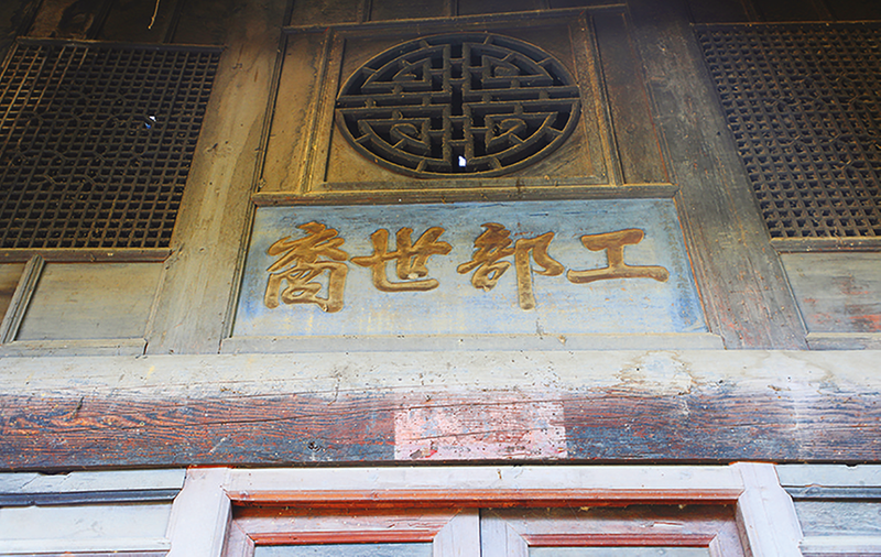 匾文:工部世裔。工部,古代官署名;汉代有民曹,魏晋有左民、起部,隋唐因北周工部旧名总设工部,为六部之一,掌管各项工程、工匠、屯田、水利、交通等政令,长官为工部尚书,下设侍郎、员外郎等职。世裔,指世胄,意思是贵族后裔。安史之乱后,唐朝政局变乱,边疆形势危机,唐代宗广德二年(764年)春,严武入蜀任成都尹,又接替高适兼任剑南节度使,期间表荐杜甫为检校工部员外郎,作为自己的参谋,因此后人又称杜甫为杜工部。当地杜姓宿老讲,他们的先祖系陕西杜氏,出自京兆堂杜氏一脉,与唐朝大诗人杜甫同出一族或其后裔,后辗转迁徙至此,故称自己为工部世裔。匾为木质,磁青底金字,字体雄健有力,敦厚端庄,点画圆满周到,不失威严,尤显神秘,其色鲜艳夺目,本为皇家专用,用此民宅,此为越制。窥此一斑,可知晚清地方大族势力增强,朝廷为嘉励和拉拢地方势力,放松了对匾额使用权的严格管控。据刘光瑞所著《中国匾额学》一书所论,当时制作一面这样的匾需用土漆10斤,黄金2两打金箔,用功半月。贴着金箔的“工部世裔”四个大字在磁青色的底色的衬托下,悬挂于生员杜蔚故居正堂之上,彰显着昔日其主人的地位之高和财势之大。