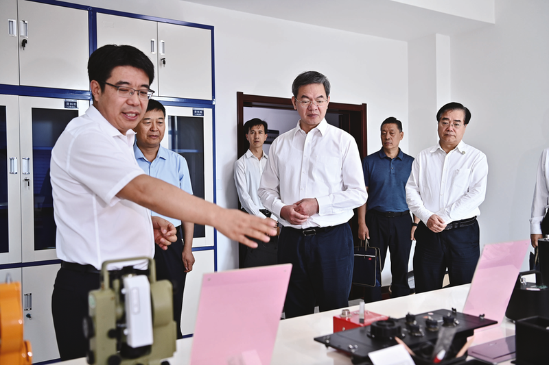 图为庄国泰在省地震局西北地震检测仪器维修中心了解新型地震仪器研发和测试情况。