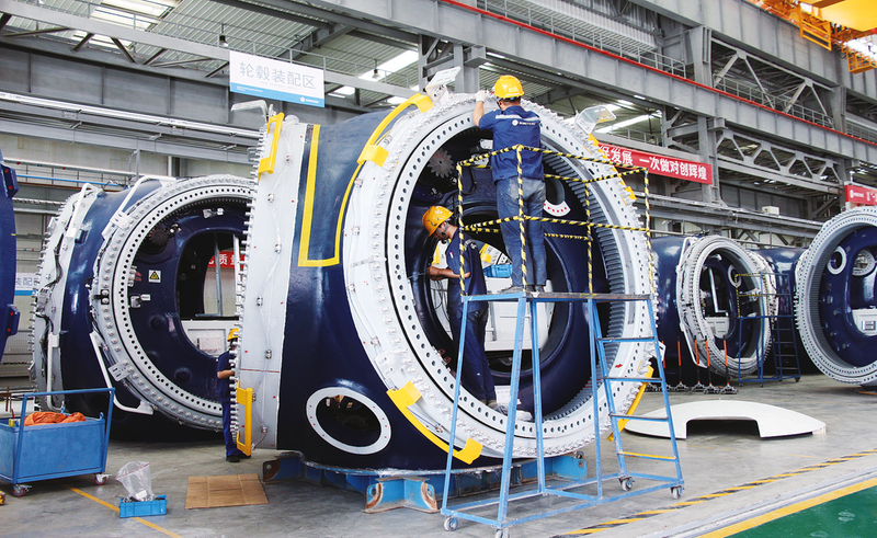 酒泉市是全国风能资源最为丰富、开发条件最为优越的地区之一。基于酒泉市新能源产业发展规划,2022年12月,明阳智慧绿色能源装备制造产业园项目建成投产,分期建设大型半直驱风机总装、锻造件、储能、电气设备等项目。项目全部建成后,预计可实现年产值100亿元,带动就业1000人。图为甘肃明阳智慧能源有限公司员工正在进行轮毂装配。