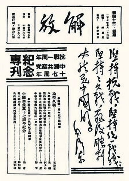 中共中央机关刊物《解放》杂志第43、44期出版“纪念中国共产党成立十七周年”专(合)刊,封面是毛泽东的题词:“坚持抗战,坚持统一战线,坚持持久战,最后胜利必然是中国的。”《新中华报》《群众》等报刊也都相继以大字号、大版面刊登纪念党的诞辰文章。
