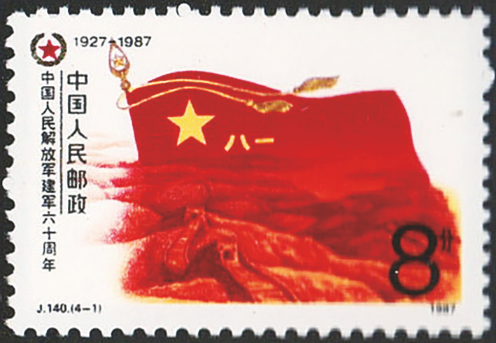 1987年8月1日,原邮电部发行的《中国人民解放军建军60周年》纪念邮票一套4枚。其中第1枚“军魂”(图五),邮票上一面鲜红的“八一”军旗迎风飘扬,旗下是蜿蜒的万里长城,代表了中国人民解放军是保卫祖国和人民的“钢铁长城”。