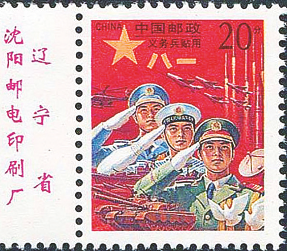1995年8月1日,原邮电部试发行一套“义务兵专用”邮票1枚(图六),票名为“神圣的使命”(俗称“红军邮”),图案以红光四射的“八一”军旗为背景,以现代化的飞机、坦克、火箭和象征和平的白鸽为衬托,画面是威武的陆海空三军,显示我军钢铁长城般攻无不克、战无不胜的精神风貌。这枚邮票在原沈阳军区驻东北三省的义务兵中试用期间,发现不易管理,决定于1997年4月15日停止使用。