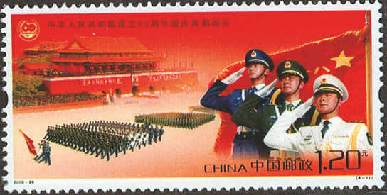 2009年10月1日,中国邮政发行的《中华人民共和国成立60周年国庆首都阅兵》纪念邮票一套4枚。其中第1枚“徒步方队”(图七),图案为中国人民解放军三军仪仗队执旗手和护旗手在军旗下行军礼。