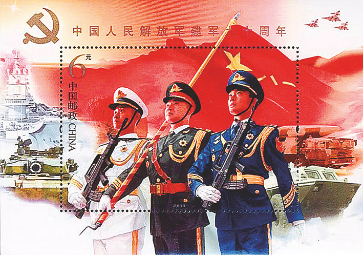 2017年6月20日,香港特别行政区邮政局发行了《中国人民解放军进驻香港二十周年》邮票小型张“威武文明之师”(图八)。邮票主图展示的是在“八一”军旗引导下,中国人民解放军陆、海、空三军仪仗队的威武风采。
