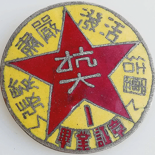 抗大第一期毕业证章,圆形,铜质,镶珐琅漆。证章正面为黄底,一颗鲜红的五角星将证章分为数个区间,从右至左分别镌刻“团结”“活泼”“严肃”“紧张”及“毕业证章”等繁体字,五角星中部镌刻“抗大”二字,下方刻阿拉伯数字“1”,即第一期。