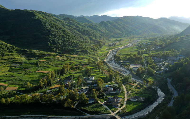 岷县秦许乡百花村,错落有致的民居与青山绿水、阡陌田园、农村道路等交相辉映,构成了一幅和美乡村田园画卷。