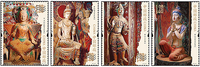 第2枚:唐代胁侍菩萨像。邮票画面选自敦煌莫高窟第328窟胁侍菩萨像。方寸之间呈现的是弥勒的左胁侍菩萨以及弟子等,细腻刻画了唐代佛教艺术的辉煌成就。