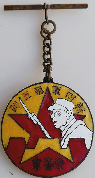 抗战期间,新四军第五师在武汉外围建立了地跨鄂豫皖湘赣边辽阔的抗日民主根据地,在38个县建立了抗日民主政权,在武汉周边与日伪军进行了殊死斗争,尤其是1942年5月至12月,第五师经受住了日伪军一万多人长达8个月的疯狂扫荡。在孤悬敌后的情况下坚持敌后抗战数年之久,新四军第五师有力地牵制了华中日军,实现了对盘踞武汉之敌的战略包围,进而同全国人民与兄弟部队一起,最后打败了日本侵略者。在艰苦卓绝的战斗中,新四军第五师广大官兵不畏牺牲,英勇顽强,对日伪军主要作战达1262次,取得了夜袭孝感城、三打侏儒山、血战大山寺等战斗的胜利,击毙击伤日伪军4万多人。目前发现的新四军第五师荣誉章,有1940年、1943年、1944年制作的两种,这枚荣誉章,就是1943年制作的奖章之一,用于奖励在战斗中涌现出来的战斗英模。