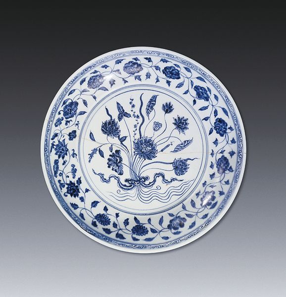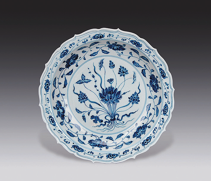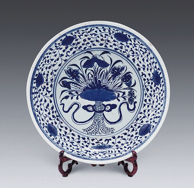 在器形上,“青花一束莲”主要以盘为主,也有盒、罐、碗、壶等生活用器。元朝中叶曾烧造过一些仿古青铜器的样式,如“方口尊”等,如今极为罕见。外销瓷中的“青花一束莲”,主要器形有大盘、广口盘、深口盘、将军大罐等观赏器,真正意义上的实用器极少。