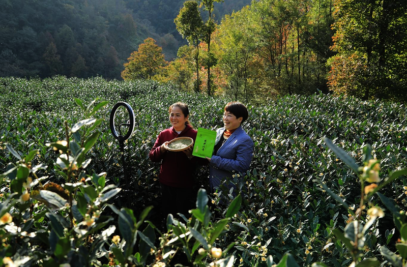 近年来,文县范坝镇依托自然资源和地理气候优势,大力发展半山区茶叶种植,以“合作社+农户+党支部+电商”的经营模式,打造千亩集休闲、观光、采摘、制茶等农文旅于一体的高山生态茶园,促进农户共同持续增收致富,助力乡村产业全面振兴发展。图为陇南市文县范坝镇关子村茶产业致富带头人与乡邻正在直播网销茶叶。 通讯员李旭春摄影