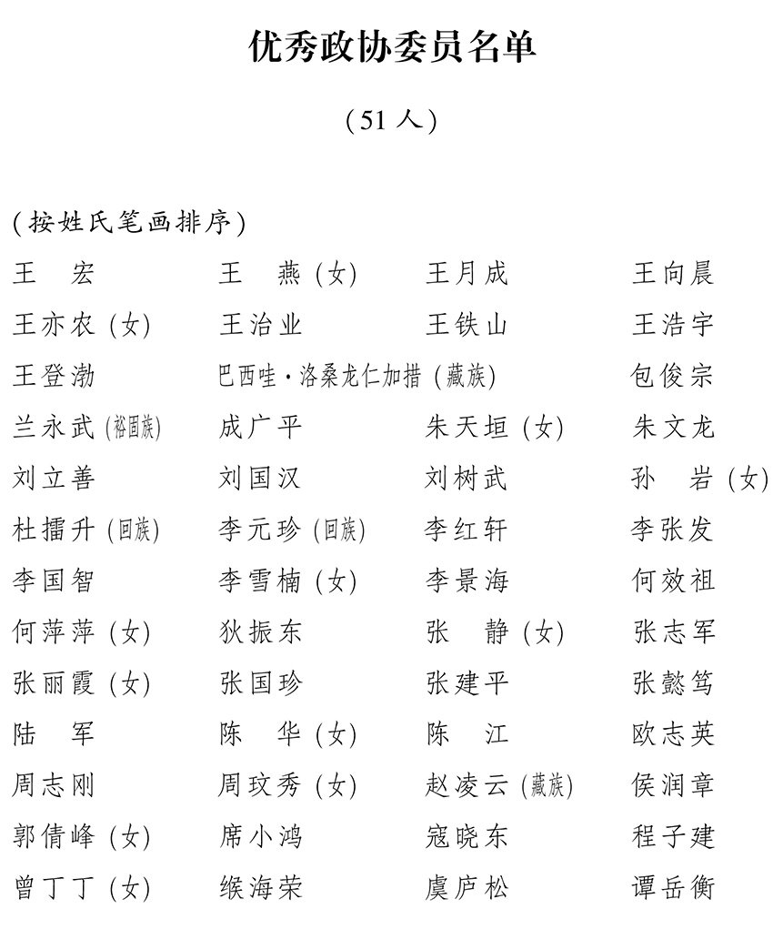 为激励广大政协委员奋发有为、为国履职、为民尽责,进一步强化使命和责任担当,调动委员履职积极性,推动我省人民政协事业高质量发展,经政协甘肃省第十三届委员会第二十五次主席会议审议通过,决定对王宏等51名优秀政协委员予以表扬。