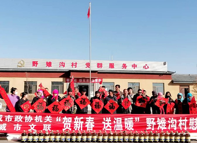 近日,武威市政协机关联合市文联在天祝县华藏寺镇野雉沟村开展“迎新春送温暖”走访慰问活动,向33户已脱贫户送去价值近1万元的米、面和清油。同时,组织文化艺术界志愿者为群众现场写春联、送“福”字,营造了浓厚的节日氛围。通讯员梁钰 摄影报道