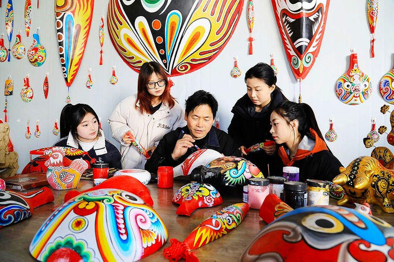 乙巳春节期间,陇南市徽县银杏镇马山村非遗工坊内,省级马勺脸谱传承人马龙和返乡大学生一起创作着春节社火脸谱。
