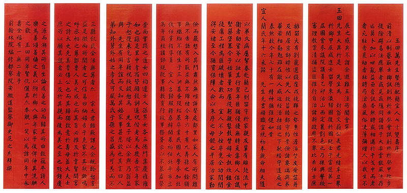 在白银市会宁县博物馆,收藏有一套《玉田先生暨德配蔺宜人七十双寿序》。寿序为红宣墨书楷书八条屏,每屏长199厘米,宽50厘米。这是清末绍兴进士范之杰撰文书写,送给会宁进士万宝成夫妇的寿序(祝寿文)。其文章精妙,书法卓绝,是不可多得的寿序精品,也是两位进士同年情谊的见证。