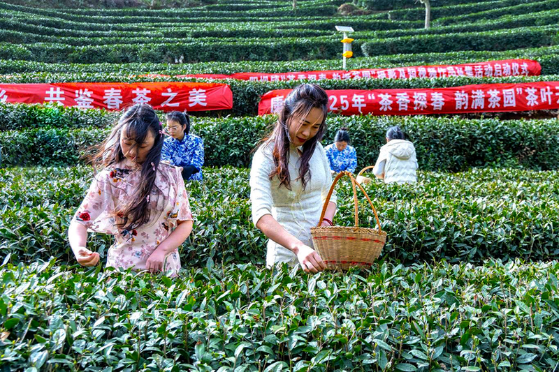 近日,康县阳坝镇在宋沟村举行“茶香探春 韵满茶园”2025年春茶开采启动仪式。据了解,阳坝镇现有茶园面积3.2万亩,预计加工春茶360吨,产值可达6000万元。近年来,阳坝镇积极探索“合作社+农户+基地+公司”的发展模式,紧紧围绕建基地、提品质、打品牌、增效益的发展思路,走出了一条茶特结合、茶旅融合发展的新路子。图为3月27日,采茶姑娘们身着采茶服饰,在宋沟村茶树间采摘明前茶鲜叶的场景。 本报通讯员马步虎摄影报道
