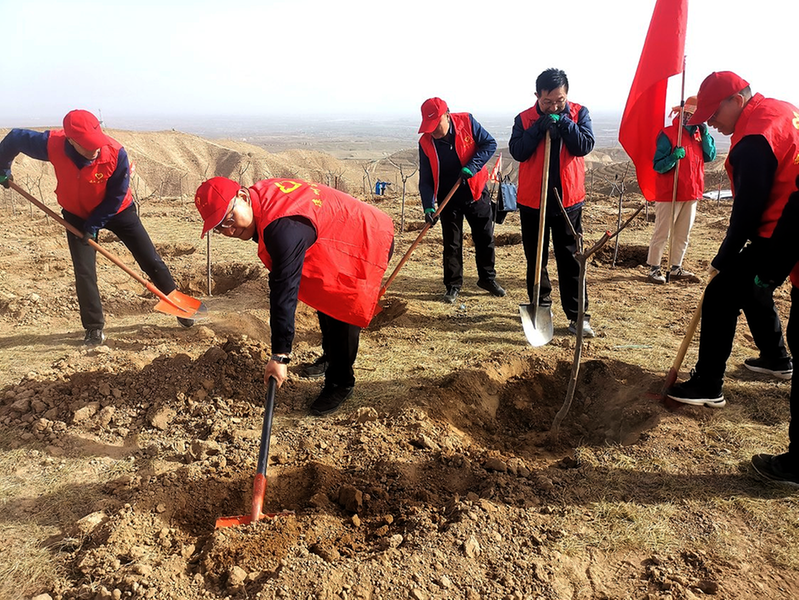 4月7日,凉州区政协组织机关全体党员干部赴南部山区碳汇林建设区开展义务植树活动。植树现场,干部们分工协作、默契配合、干劲十足,挥锹铲土、扶苗填坑、培土浇水,各个环节井然有序,一派热火朝天的劳动景象。通讯员刘霞摄影报道