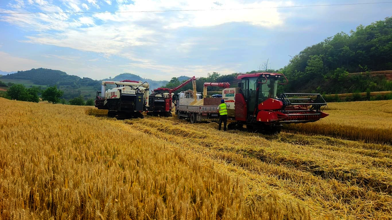 夏收时节,走进徽县栗川闫庄村的千亩小麦种植带,金色的麦浪随风起伏,沉甸甸的麦穗迎风摇曳,一台台农机往来穿梭,收割、脱粒、粉碎秸秆、打捆、旋耕等工序一气呵成,勾勒出一幅抢收抢种的壮美丰收图。随着14.6万亩小麦陆续成熟,为确保夏粮颗粒归仓,徽县统筹调度农机3000余台套,投入联合收割机600余台,设立农机维修服务站15个,培训机手及技术人员720余人次,为夏收高效、安全作业提供了有力保障。图为收割机在闫庄村作业的场景。 本报通讯员何方 燕宏瑞 摄影报道