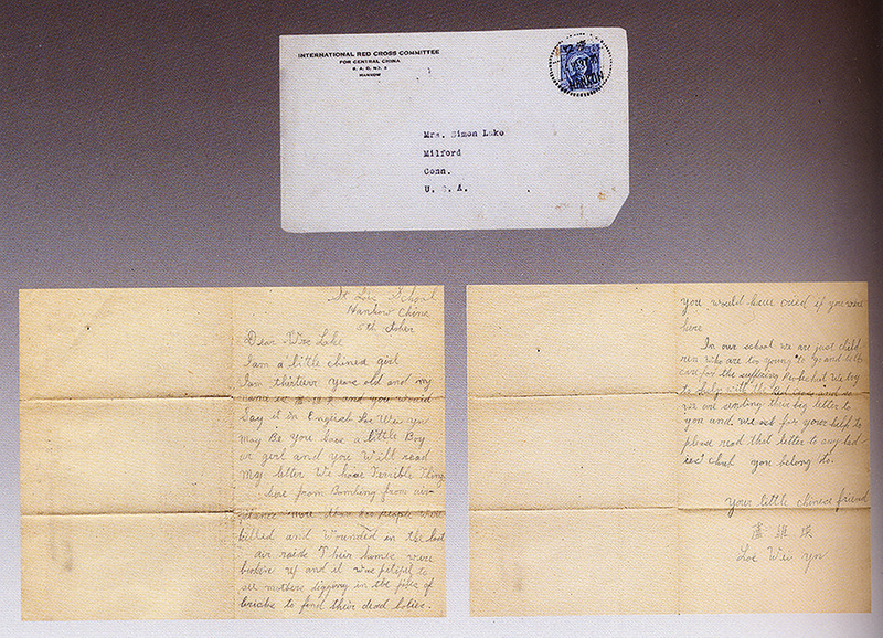 “亲爱的西蒙雷克女士,您好!我是一个来自中国的小姑娘,今年13岁,中文名叫卢维瑛。希望您能收到我的这封信。我们正经历着一场可怕的战争,空袭中已有800多人失去了生命。母亲从碎石堆里用手挖出了她们死去的孩子,如果您在场一定会为之伤心不已。学校里虽然都是些孩子们,尽管我们年幼,但我们尽力帮助红十字会做些力所能及的事情。为此,我们给您写信,并将红十字会劝捐信一并寄给您,希望您能将它带到您所属的教会。您的中国朋友卢维瑛。”