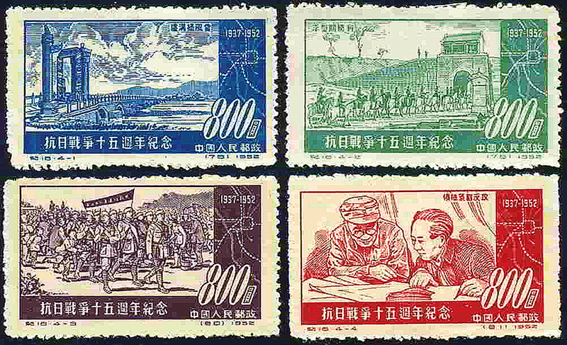 1952年7月7日,原邮电部发行了《抗日战争十五周年纪念》邮票一套4枚(图二),这是新中国邮票发行史上,唯一在7月7日发行过的抗战纪念邮票,具有极为特殊的意义。邮票图案分别为“卢沟桥风云”“平型关胜利”“欢送新四军抗日”和“领袖策划反攻”。其中第一枚邮票图名为“卢沟桥风云”,颜色为深蓝色。画面中美丽的卢沟桥和桥东的碑亭,平静而安详地矗立在祖国的土地上,仿佛在无声地诉说着这片土地的神圣不可侵犯。卢沟桥的上空弥漫着满天风云,象征着暴风雨的来临,预示着战争的爆发。桥下奔流着永定河水,源源不尽地流淌着,好比中国人民无穷的力量,奔腾不息。远处的西山层峦叠嶂,犹如坚固的长城,守卫祖国这块壮丽的河山。该套邮票图案的右上角,统一绘有“七七卢沟桥事变”的地理位置略图,并标着“1937—1952”字样,清晰地标注了那段历史的时间跨度,让后人铭记抗战的历程。