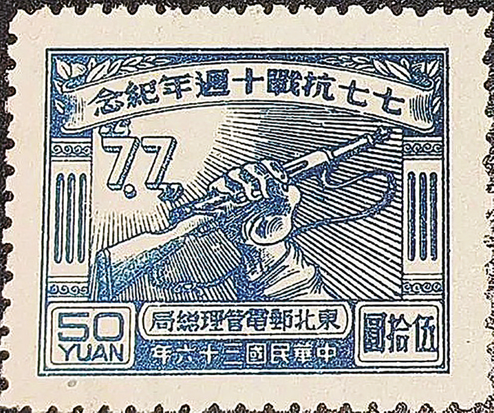 1947年7月7日,解放区东北邮电管理总局发行了《七七抗战十周年纪念》邮票一套4枚(图一),这套邮票同图异色,面值分别为东北币10元(橘黄)、30元(绿色)、50元(灰蓝)、100元(棕色),分有齿、无齿两种,采用胶印版,纸张为水印绢丝纸。邮票主图为战士巨手高举钢枪,展现出全民团结一致、誓死抗战的决心。邮票左上方阳光四射,明亮处的立体字“7.7”犹如划破黑暗的曙光,象征着抗战胜利的曙光初现。邮票上部飘带内“七七抗战十周年纪念”字样,庄重而醒目,铭记着那段艰苦卓绝的抗战岁月。