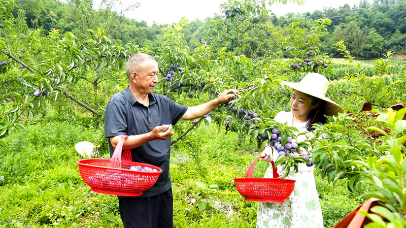 盛夏时节,瓜果飘香。走进徽县永宁镇陈添果有机家庭农场的果园里,一串串饱满的凤凰李挂满枝头,紫红色的果皮裹着一层天然果霜,宛如一颗颗紫玉缀满枝头,吸引周边游客前来采摘品尝。该农场凤凰李采用有机种植方式,从开花到挂果,坚持不用化肥、不打农药,全程施用有机肥,通过科学控水控温保证果实品质。图为游客在果园里采摘凤凰李。本报通讯员高琼 摄影报道