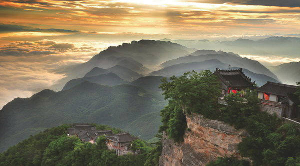 风来时,我抬头仰望龙洞,仰望二梁子,仰望群山之巅的嵋峈峰,殿宇楼台,层层级级,千年古刹,钟磬悠悠,云遮雾罩的远山披着钢蓝色的黛蓑,舞动着碧绿的绸缎,天马行空的鸟儿只朝着高高的山峦飞去,体态雄健。当蒸腾的云雾被风追赶,过一会儿,便见太阳钻出云缝,照到半山和山顶上,出现一道道让人心灵为之感动和安详的金光。