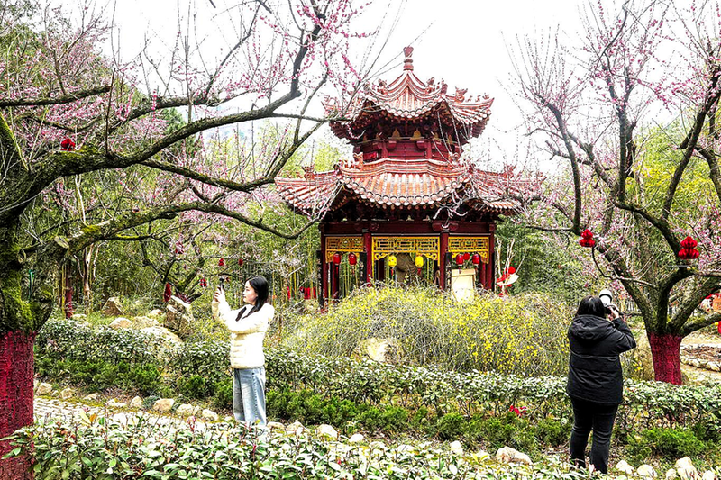 梅蕊腊前破,梅花年后多。进入3月,成县杜甫草堂内梅花盛开,树树红梅映着青山碧草,给新春增添了无限浪漫,吸引了大量游人前来游玩赏花。图为游客在成县杜甫草堂内观赏梅花、打卡拍照的场景。 通讯员吴庭栋摄影报道